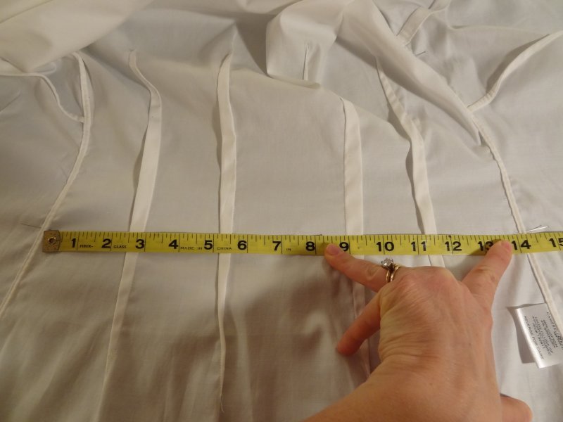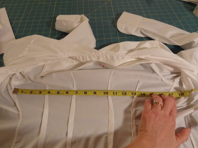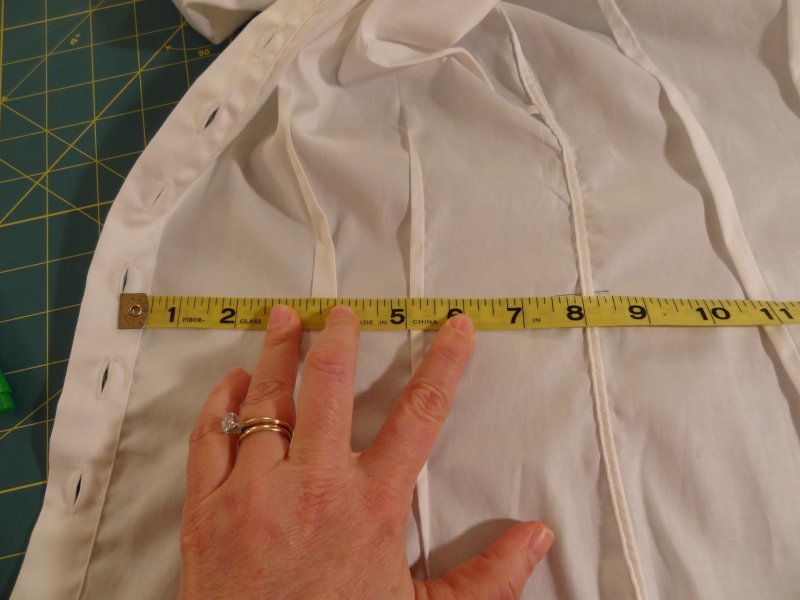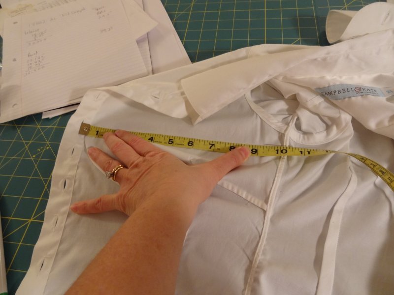 We begin measuring the bust at the point 1 inch below the armhole seam (see the photographs at the bottom of this page). We go from button to buttonhole, being careful to flatten out the bust dart area in a straight line from each side seam to each center placket (again, see the photographs).